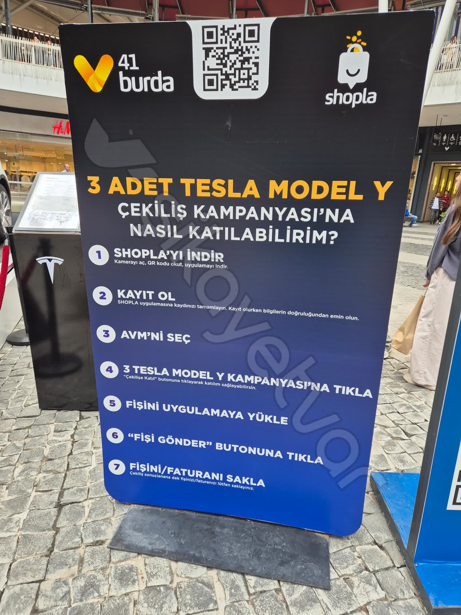 Alışveriş merkezinde bulunan mağazalardan yapacakları, toplamda her 500 TL’lik alışveriş tutarına 1 çekiliş hakkı kazanacak ve çekiliş sonucunda toplam 3 adet Tesla Model Y, sahiplerini bulacak. Katılım başvuruları, AVM’nin mobil uygulaması “Shopla” üzerinden gerçekleşecek. Çekilişe katılmak için, AVM’den yapılan alışverişlerin fiş/faturaları, AVM’nin mobil uygulaması “Shopla” ya yüklenmesi gerekiyor.