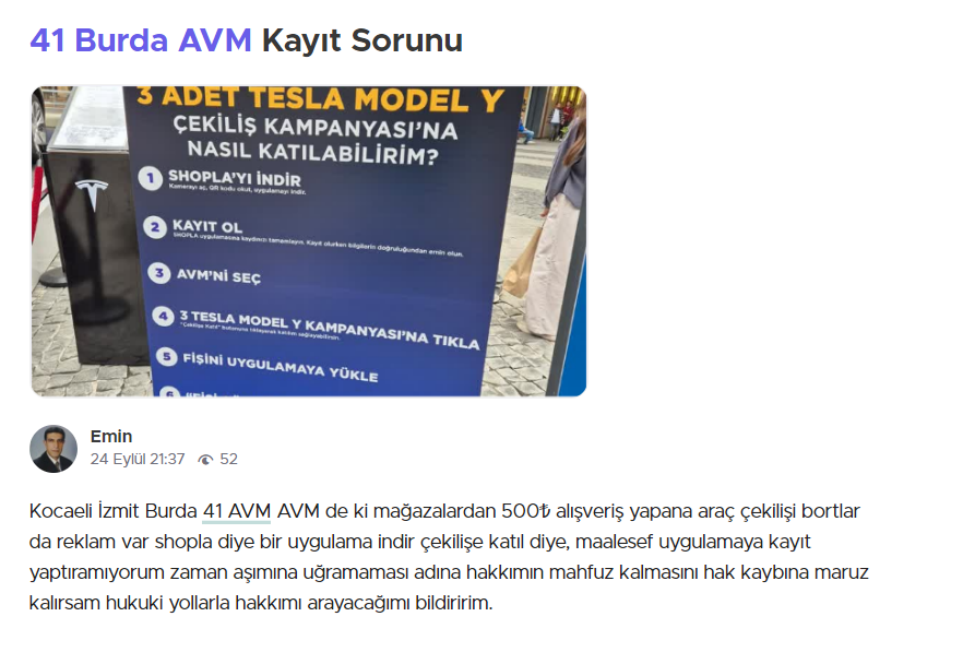 Fakat çekilişe katılmak isteyen bir vatandaş yaşadığı aksiliği anlattı. Alışverişini yaptığını fakat uygulamaya kayıt yaptıramadığını söyleyen vatandaş” Kocaeli İzmit Burda 41 AVM AVM de ki mağazalardan 500₺ alışveriş yapana araç çekilişi bortlar da reklam var shopla diye bir uygulama indir çekilişe katıl diye, maalesef uygulamaya kayıt yaptıramıyorum zaman aşımına uğramaması adına hakkımın mahfuz kalmasını hak kaybına maruz kalırsam hukuki yollarla hakkımı arayacağımı bildiririm.” Dedi. Şikayetvar.com üzerinden durumu anlatan vatandaş “Dönüş yok çekilişe katılmak için süre pazartesi günü müracaat son gün shopla uygulaması hiçbir şekilde kayıt yaptıramıyorum ekte alışveriş fişim mevcut 6 çekiliş hakkına sahibim ama maalesef uygulamaya kayıt yaptıramıyorum” ifadelerine yer verdi.