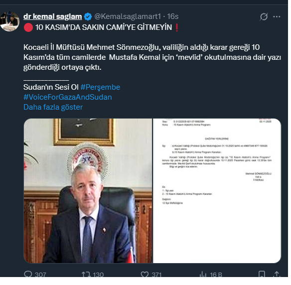 Mustafa Kemal Atatürk’ün ebediyete irtihalinin 87. yılı dolayısıyla Kocaeli Valiliği anlamlı bir karara imza attı. 10 Kasım 2025 Pazartesi günü, Kocaeli’deki tüm camilerde Atatürk ve silah arkadaşları için Mevlid-i Şerif okuma kararı alındı. Fakat sosyal medyada hızla yayılan karar pek çok isim tarafından tepkiyle karşılandı. Yapılan paylaşımların çoğunda 10 Kasım’da camiye gitmeyin çağrısı yapıldı. İşte o paylaşımlar;